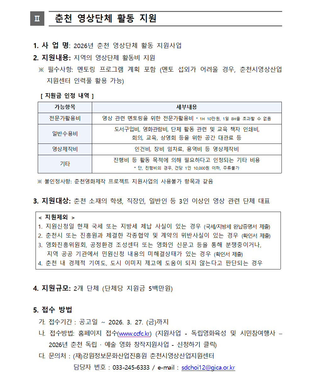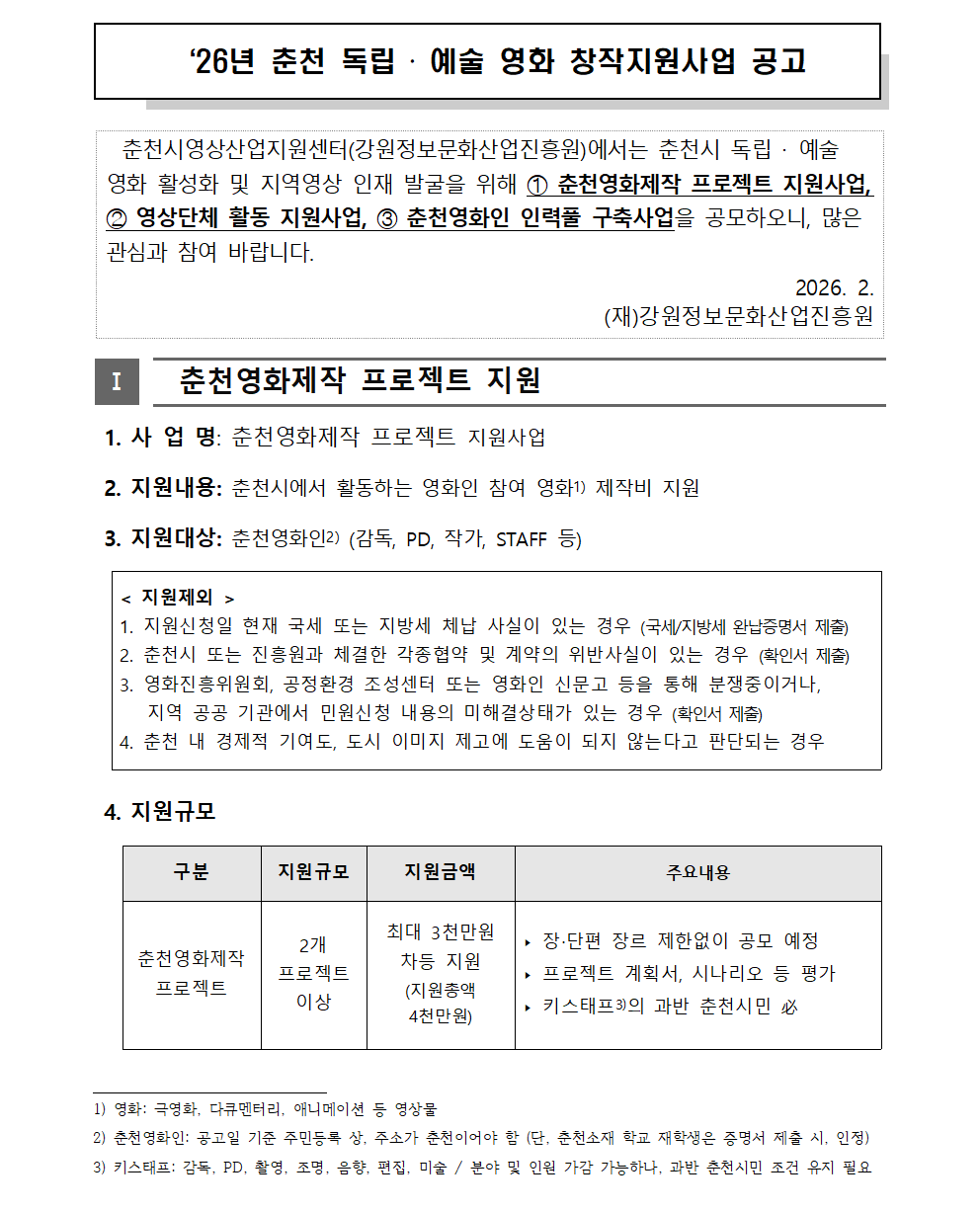 2026년 춘천 독립 예술 영화 창작지원사업 공고